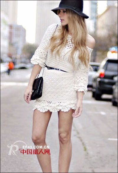 白色的镂空连衣裙很是性感妩媚,露单肩的设计在性感的镂空裙上有加上一笔,双重性感羡煞旁人。纯净的白色让MM看起来很是优雅大方,收腰的设计更是展现女人的优美曲线,黑色的单肩包搭配上黑色的遮阳帽,整体装扮很有文艺气质。