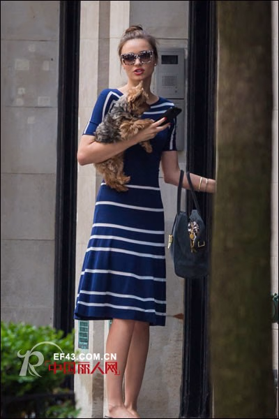 海军蓝的条纹连衣裙很显身材,横条纹的设计,若不是身材出众,很容易显胖。米兰达傲人的身材就能轻松hold住,搭配上黑白印花太阳镜,灰色鹿皮手拎包,休闲又不失时尚度。