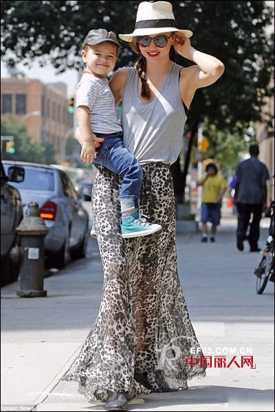 年度最辣辣妈必须是米兰达可儿。身穿灰色棉质背心搭配印花雪纺长裙的她,即便是抱着孩子,也显得时尚度十足,黑色墨镜点亮气场。不仅是米兰达自己,连她的儿子也被打扮得潮范儿十足。