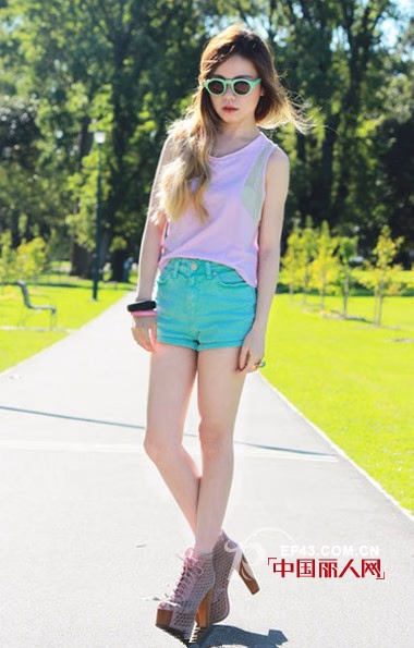 背心+短裤的搭配绝对是屡见不鲜了,但如何才能避免穿出家居服的感觉,一定要花点小心思,紫色和湖蓝色的撞色绝对是街头吸睛的好选择。