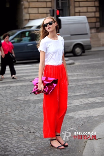 极简的欧美风格穿衣愈演愈烈,白色和红色的碰撞果然是美得不得了,阔腿裤是粗腿腿MM的制胜武器,搭配依然简约风平底凉鞋,不需要过多修饰就已经能够Hold住众人眼球了!