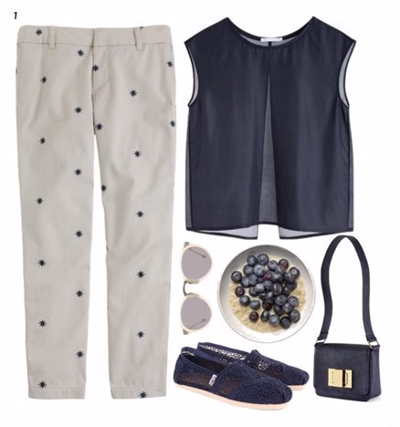 藏青色雪纺无袖上装有微透视的穿着效果,搭配颇具质感的白色裤装,小小多边形pattern和上装的色调相互映衬,同色系平底鞋&复古背包都是绝佳的吸睛纳品。随意的look非常适合和闺蜜出街时选择哦。