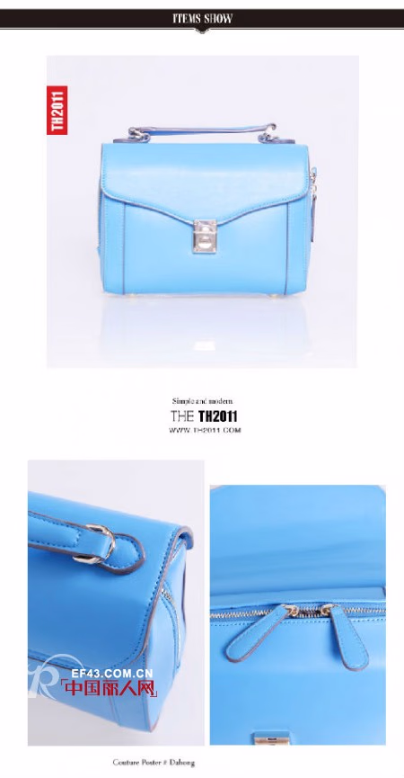 象征夏日青春活力的粉蓝色单品,日常街拍都少不了它。亮色能让心情和肤色都变得亮丽动人。这款粉蓝色包包清爽又好搭配,与TH2011夏季各系列裙、衫搭配在一起,都是非常经典且优雅的搭配。 (编号:TB350100 ¥329.00)