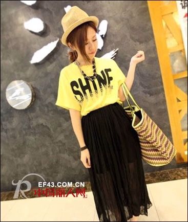 简约但是不失时尚的搭配,款式款式的柠檬黄T恤,藏肉显瘦,黑色的雪纺长裙,浪漫飘逸,透视装的裙摆性感妩媚,加上个性的人字头,夏季上街最是时尚了。