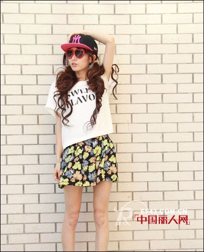 很是俏皮可爱的装扮哦,清新白色t恤,宽松的款式藏肉显瘦,黑色的英文字母印花有种俏皮的味道简约显大方,搭配花色短裙,像是夏天绽放的花朵那么的美艳动人,T恤不在显得单调,还有意思甜美在里面哦。