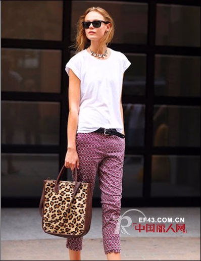 白色短袖T恤经典不败,是夏季必备的单品。简约大方的风格,清爽时髦,给人的感觉也很舒服呢。搭配九分裤,平底鞋,配上豹纹手拎包,欧美潮范儿。