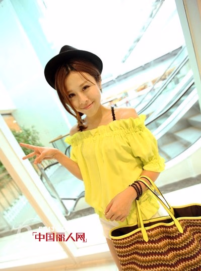 亮丽的黄色就很吸睛好看了哦,时尚的一字领设计,让MM们露出香肩锁骨,很是性感妩媚,宽松的T恤,藏肉显瘦,搭配上百搭的白色短裤,甜美大方不失女人味。