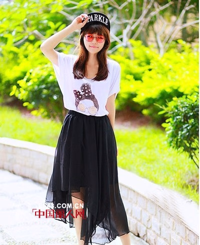 T恤搭配上长裙,夏季超级显瘦显高的优雅搭配,款式宽松的白色T恤,俏皮的娃娃头印花,搭配上不规则裙摆的雪纺半身裙,飘逸好看,优雅大方很有气质哦!