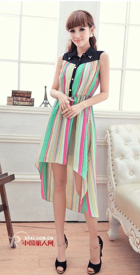 波西米亚风的长裙,撞色的竖条纹与民族风浓郁的彩色混搭,非常修身显气质,拼皮领增添性感,瞬间提升整体气场,燕尾裙摆设计优雅帅气,大大拉伸身材线条比例。