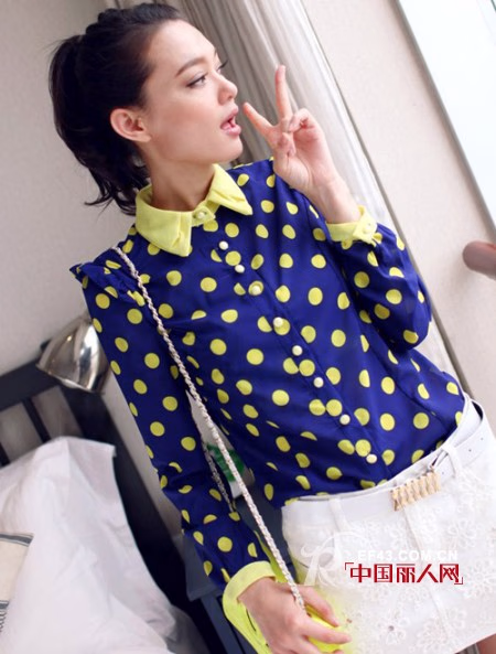 翻领合身版型,前身精致珠光纽扣衬衫,秀气可爱,洋气的颜色、鲜活的撞色翻领以及波点图案,魅力无限;肩部木耳边的设计更显精气十足,搭配白色包臀裙,轻松秒杀路人。