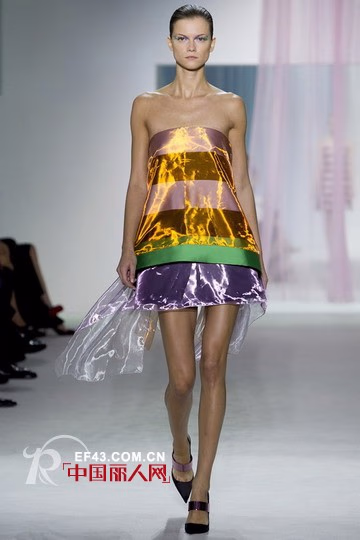 有光泽的面料,金属色印花,彩虹般的光芒,都劲情的呈现在2013春夏的T台上。例如:Alexander Wang,Louise Gray和Mulberry。大量的金属色光泽是2013春夏T台充满了魔力,当受到光线照射,色彩变得丰富,轻薄的面料漂浮在身体上发射出神秘的光芒。Burberry Prorsum和Jonathan Saunders走极简路线,线条简洁,经典廓形是成功的关键。博柏利-珀松 (Burberry Prorsum) 让彩虹色电光面料本身成为焦点,至于其它方面,仅仅保持品牌原有的简洁线条和经典廓形就足够。迪奥 (Dior) 让具有光泽感绿色、鹅黄色欧根纱因细节褶皱设计呈现出波光粼粼的视觉效果,灵动活泼。沉溺于最颓废的方式——亮光泽。虽然闪闪惹人爱,但是富有Disco精神的光感时装驾驭起来需要些功力,最好选择一款Diane von Furstenberg彩色亮片礼服搭配奢华的配饰,牛仔裤和匡威。尽量选择最闪亮的面料,配件应保持最小和样式时髦的款式。