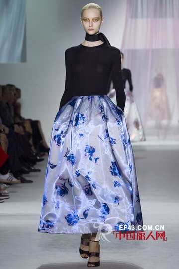 太过大胆的变动和太过保守的致敬,都会让新入主品牌的设计师受到诟病,而拉夫·西蒙 (Raf Simons) 本次的“中庸之道”,却可以让他赢得不少的掌声。黑色紧身上衣与手绘玫瑰长裙的组合,拉夫·西蒙 (Raf Simons) 坚守的“纯粹主义”,与迪奥 (Dior) 对女性优美轮廓的极致追求、对华丽的定义,在这样的造型中融为一体。