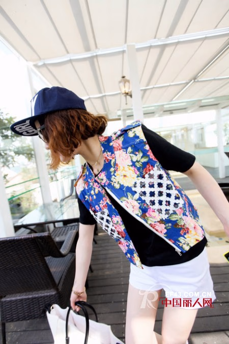 本季的印花依然是时尚人士宠爱有加的元素,被剪裁成马甲的款式又是设计师们匠心独运的设计成果了,衣前镂空的花朵图案让Look不会显得有点单一,搭配纯色T&短裤,更加将印花马甲烘托的非常出挑。