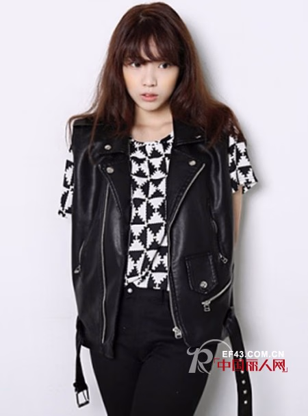 每一件单品在设计师的手下,都可以绘制成不同风格的Look,这件仿皮质马甲就是将Boylish风格很好的凸现出来,几何图案T规则有致,黑白的搭配依然是这么简单的美,PUNK味儿十足。