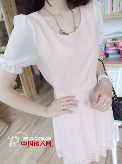 珍珠装饰小清新雪纺连衣裙,裙摆独具匠心的小设计和蓬蓬公主肩完美融合。