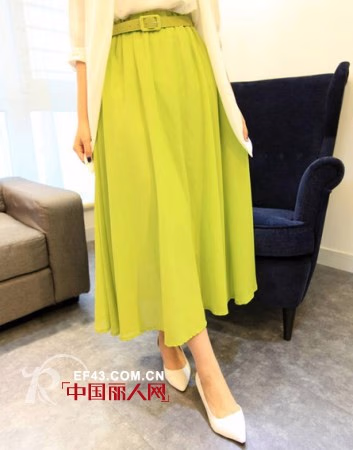 芥末绿的半身长裙是今年的新色,压褶从腰部顺垂下来,随意飘洒至脚踝。腰带的加入带来了几分淑女风,绝对的衣柜必入款。