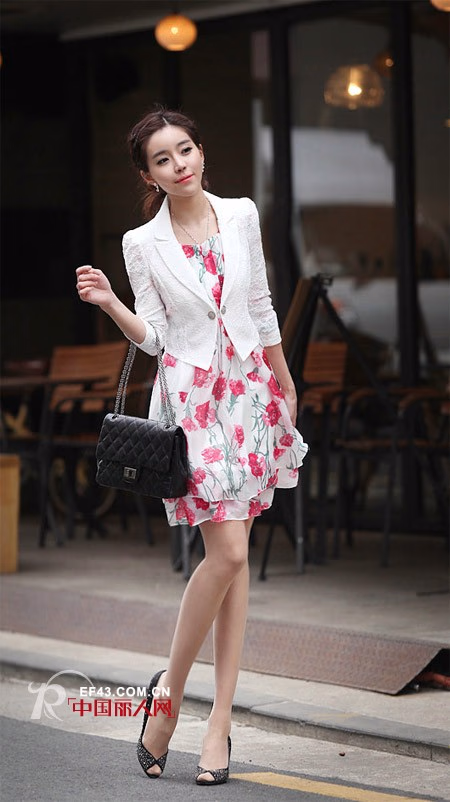 裙装是春季必穿的服装。对于上班族的女性来讲,小西装也是必备服装。这身搭配就能将裙装和小西装进行完美的集合。粉红色的花朵设计加上白色底纹会使女性显得更加清爽。外面搭配一件简单的小西装就能显出一份职业范。在加上一款精细设计的发型会使整个人精致起来。如果是上班时的穿着,可以搭配一个黑色包包和一双黑色鱼嘴鞋。