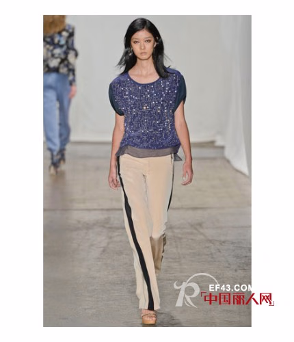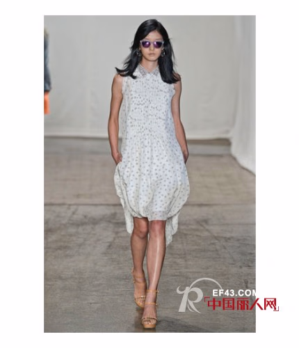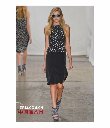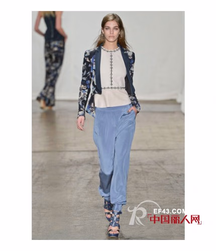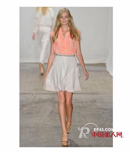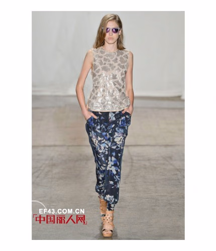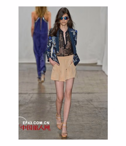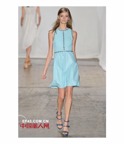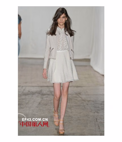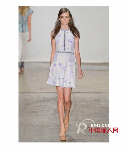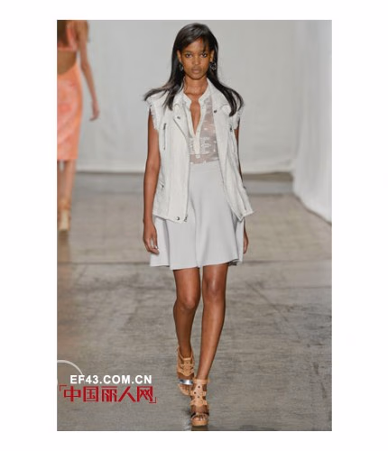 2013春夏,Rebecca Taylor的秀场上少了一份boho的元素,看起来更像是一群渴望度假的都市女孩们。这一季的设计灵感源自于”城市中的盛夏“,是将各类如阳光般明媚的海岛印象融入都市时尚的完美结合——不但有淡青绿色的摩托夹克,还有以木槿印花为图案的无袖T恤连衣裙等。除此之外,设计师还深受当下许多时尚博主的文章所启发,推出了多款运用手工水洗技术混纺而成的牛仔单品。