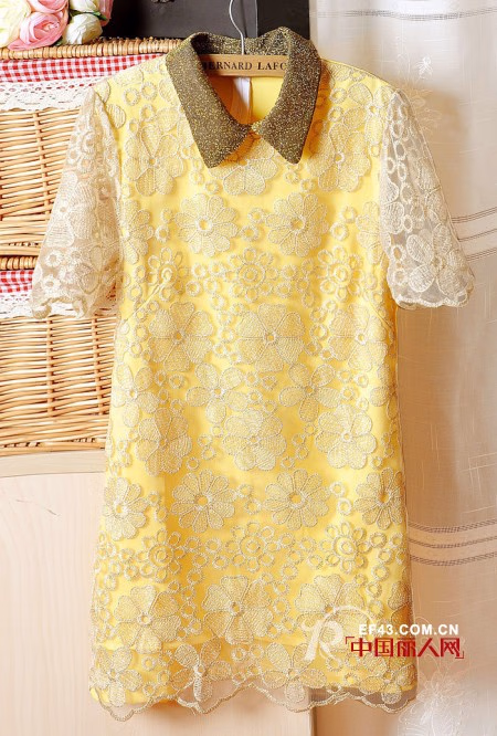 梦幻般甜美的感觉,充满公主般纯洁的色彩! 彼得潘娃娃领,精致蕾丝花朵刺绣, 可爱迷人,增添了另一种公主乖巧韵味。