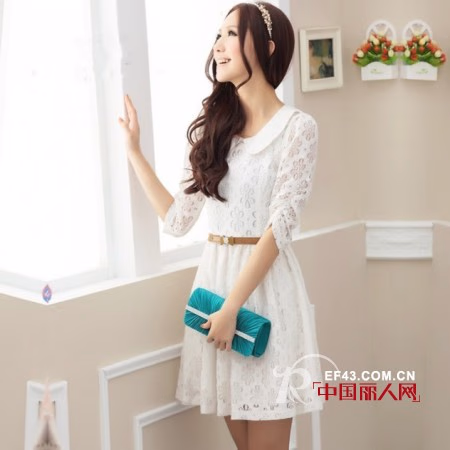 镂空蕾丝花朵、彼得潘娃娃领公主连衣裙,中袖的长度正好适合现在早晚微凉的的气候,咖啡色的精美蝴蝶结腰带装饰在腰间,甜美气息默默袭来。
