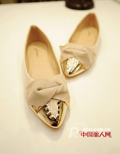 甜美名媛风,金属包头的装饰,小尖头的鞋型,蝴蝶结装饰,龟纹漆皮的平底鞋,走路不但时尚,更加的舒适。