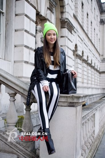 全身的条纹单品让你眼前一亮。但为了避免病号与监狱服的负面评价,横竖混搭这种既能跟上流行又能展现个性的做法更为可取。外套、长靴、包包也同样是安全的黑色,用荧光绿色的冷帽来提亮全身造型恰到好处。