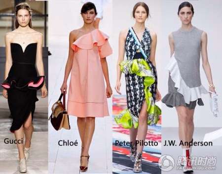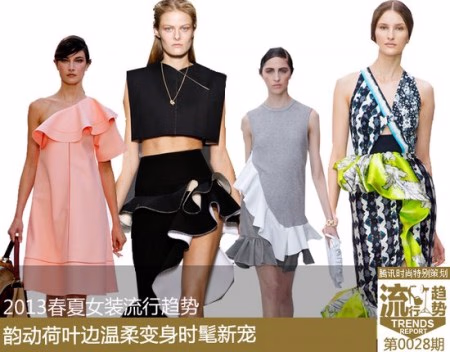 曾经由飘逸裙装引领的荷叶边热潮,沉寂了多年后,再次以潮人新宠之姿入驻时装流行趋势的首席阵营。早在Peplum风靡时尚T台和好莱坞众女星间的时候,我们就预见了更为夸张的荷叶边造型复兴。果然,今年春夏在Chole、Peter Pilotto等女性化气质品牌间这一元素欣然出场,更为惊喜的是Gucci、Balenciaga等强势风格品牌也将荷叶边糅合在设计中,以完全不同于以往的凌厉新姿态时髦回归。