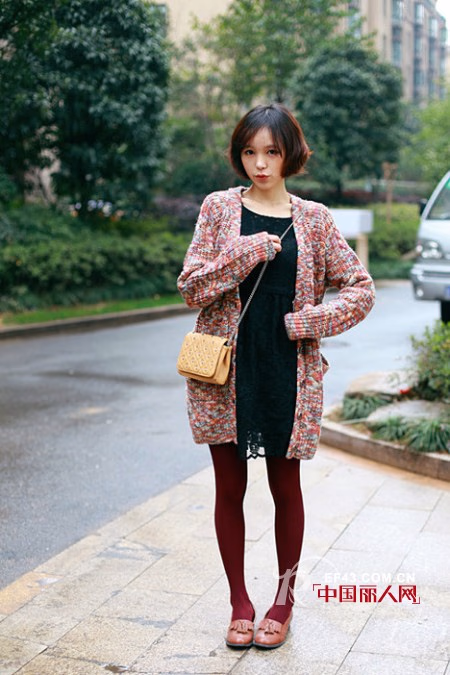 花线毛衣开衫和蕾丝裙的组合,最适合春天啦,搭配布洛克平底鞋穿出复古的味道,小背包方便易携带,酒红色连裤袜更是演绎复古的绝佳单品。