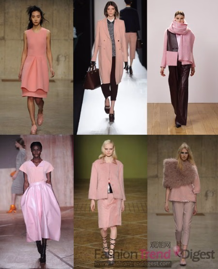 灰粉色的颜色潮流在2013秋冬女装流行发布会上频繁出现,这种有些灰尘感的色彩没有纯粉色那么娇嫩,灰粉色的受众会更加广泛,即便是上了年纪的女性也可以穿着这种灰粉色服装出门而不会让人感觉装嫩了!