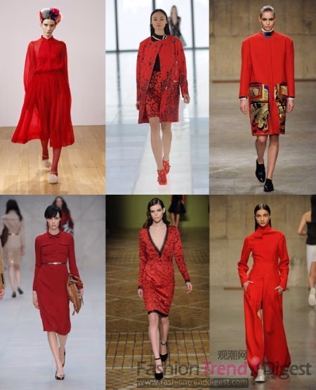 从左上开始分别是Eudon Choi, Preen by Thornton Bregazzi, Peter Pilotto, Burberry, Jonathan Saunders, J.W.Anderson秀场上的红色套装。