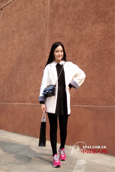 黑色打底衫与脚上的丝袜连成一体,在视觉上极大地拉长了身材比例,而且整体更显纤细。加上白色呢料中长款大衣,恰到好处的长度既修饰腿型又拉长身形。