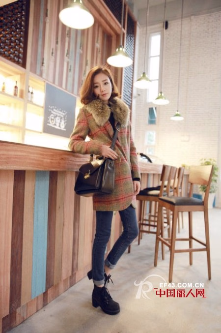 英伦味十足的格纹毛呢大衣配上毛茸茸的领子,就更加凸显轻熟感,搭配复古包袋,是今年无与伦比的至IN装扮。