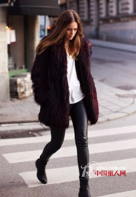 这件酒红皮草外套略显暗沉,但是细细品味,却有着红酒般香醇的味道,紧腿裤装打造至IN廓形,这样的街头秀让人欣羡不已。