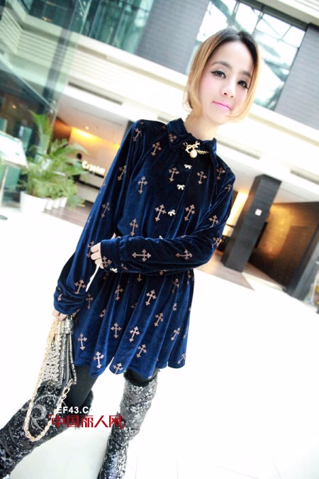 十字架翻领蝴蝶结扣金丝绒连衣裙,又女人又潮范,有点暗骚骚的金丝绒材质,就是那样的让你着迷!蝴蝶机的扣子来的够精致,够女人吧,金丝十字架的图纹够潮够吊!