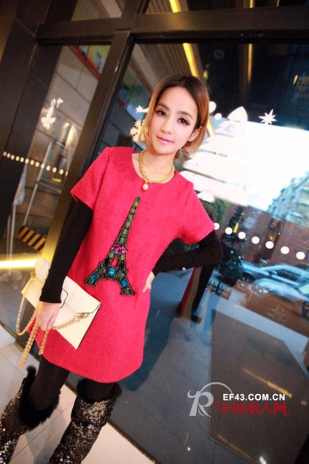 高街潮范宝石铁塔短袖毛呢连衣裙,搭配外套大衣什么的,真是绝配,搭配气场强大的皮草,也是超有范儿的,宝石制成的埃菲尔铁塔一定也吸引你的眼球吧。