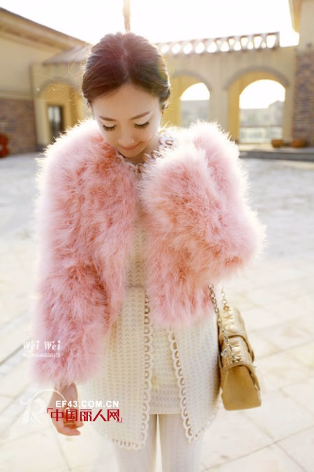 嫩粉色的鸵鸟毛皮草彰显名媛风范,嬾嫩的颜色,看着让人爱不释手!毛毛看起来很蓬松哦,内搭纯色的毛呢套装,让你变身华丽小女人,春节聚会你最大。