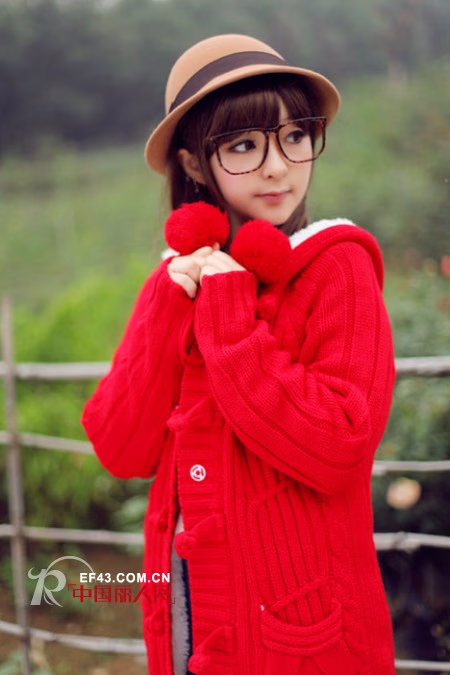 红色的加绒毛衣外套,冬季在里面套件毛衣就很暖和了。可爱的毛蛋蛋让可爱感十足。乖巧的眼睛妆让你更加彰显学院风格。
