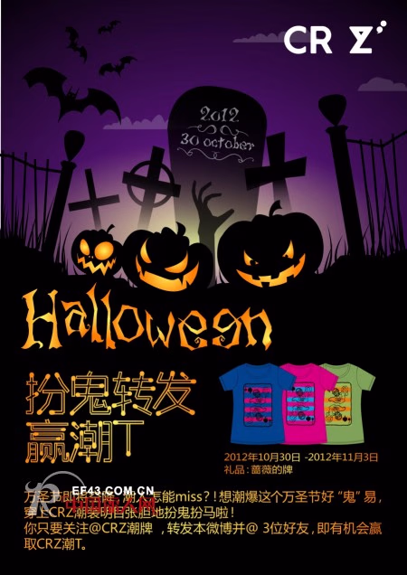 想潮爆这个万圣节好“鬼”易,穿上CRZ潮装明目张胆地扮鬼扮马啦!CRZ潮牌借势发起了#潮牌CRZ扮鬼哈啰喂转发赢潮T#微博活动,11月4日前你只要关注@CRZ潮牌 ,转发本微博并@ 3位好友,即有机会赢取潮牌CRZ潮T一件。