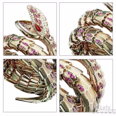 腕表做工精妙,风格现代。表镯自然延伸而成表壳,宛如蛇头,其上密嵌的钻石和红宝石,与玫瑰金材质交错生辉,更显优雅。表壳两面镶有6颗明亮型切割钻石(0.45克拉),加之33颗钻石镶嵌而成的白色珍珠母表盘,散发出令人心醉神驰的神祕魅力。象征幸运和快乐的红宝石与玫瑰金色彩的完美糅合,在钻石璀璨光芒的点缀下尽显高贵优雅。