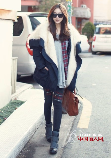 道晖芝tomnrabbit网拍照,藏青色大翻领棉服打造至IN的Outsize廓形,搭配紧腿打底袜更是将上宽下窄的潮流趋势诠释的近乎完美,韩范儿十足。