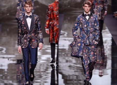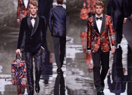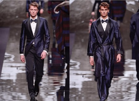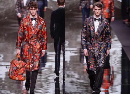除了诙谐的雪豹图案和刺绣提花的雪豹形象无处不在外,大秀的后半部,随着冰山旅客造型的结束,设计师为我们带来了面料优质而且充满独创的法国巴洛克印花的一系列优雅西装服饰,但无独有偶,刚在伦敦男装展上看到McQ带来的男士浴袍造型,在本次LV大秀上也同样出现,巴洛克印花睡袍内衬衬衫领结,这是旅行客经过一日攀山辛劳后要马上参加晚上的睡衣派对吗?