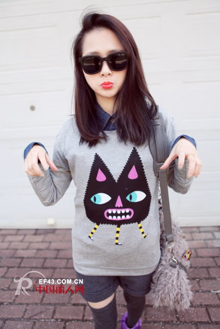 可爱的喵星人图案穿出了潮人们的态度,毛呢短裤和及膝长袜的搭配打造日系复古风格,内搭牛仔衬衫可以轻松Hold住冬季的内搭哦。
