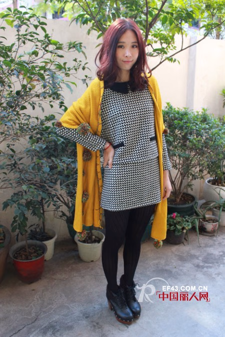 看似假两件实则One peace的连身裙穿出“假把式”,搭配一条柠檬黄色带毛球球的围巾,穿出披肩的效果。