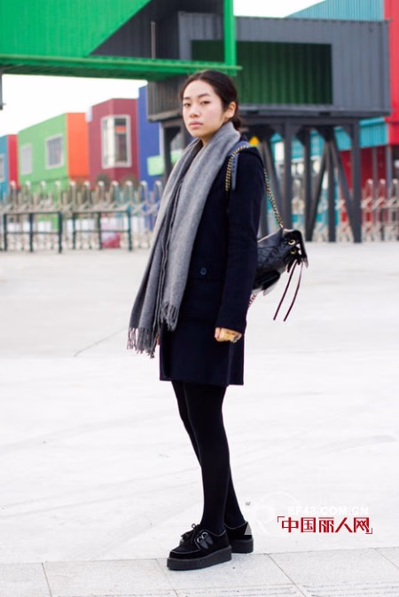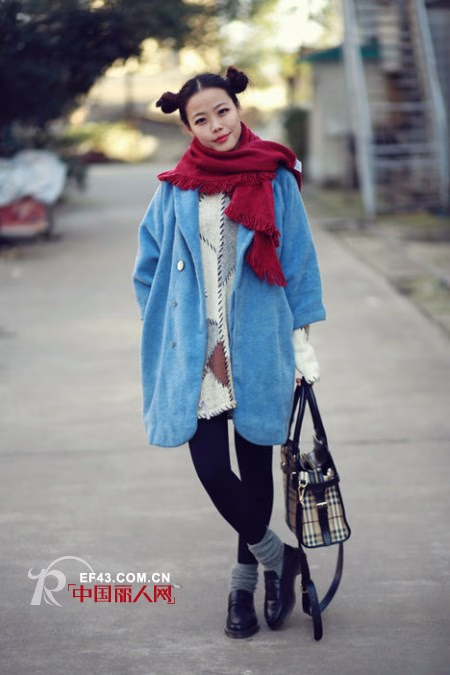 宽松款式的大衣在今年极为流行,酒红色围巾又是今年不可缺少的单品,露袜装打造日系少女风格。