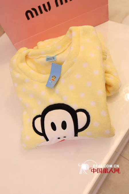超可爱的大嘴猴睡衣,珊瑚绒的面料,手感超软超舒服,上身像穿着软绵绵的棉花糖哦,波点+粉嫩的颜色,太值得拥有啦