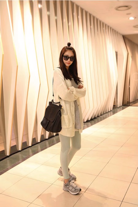 休闲运动风是韩范儿的风格,尤其是打底裤和运动鞋的搭配,更是受到了众多MM们的竞相模仿,可爱的发型让造型活跃起来。