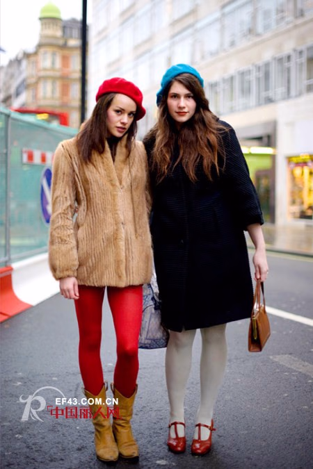 皮草外套双双上身,不同色系的打底袜和贝雷帽相互映衬着,形成一道美丽的风景,英伦复古风呼之欲出。