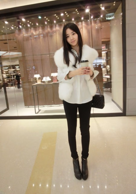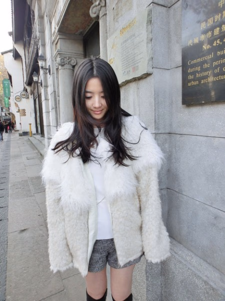 类似皮草的外套颇具存在感,搭配毛呢短裤,心机穿出苗条身材,大大的毛领很有温暖感哦。