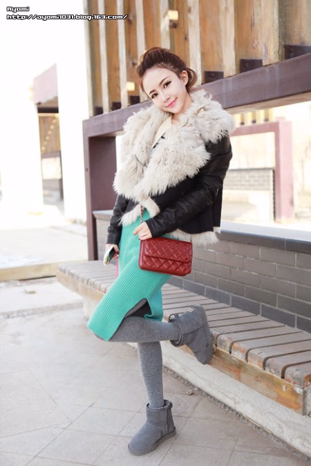 大翻毛领外套穿出宽松廓形,搭配荧光绿开口毛线裙,不同色系的搭配突出立体效果,雪地靴又是休闲装扮的制胜法宝哦。