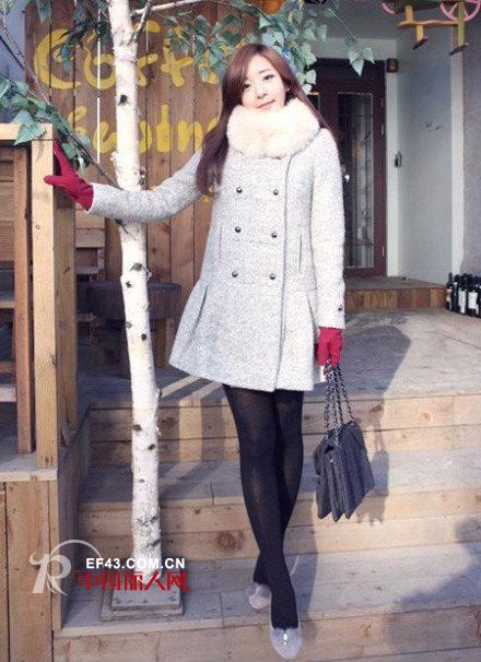 双排扣毛呢大衣名媛味十足,毛茸茸的领子很有温暖感,搭配打底袜展现完美腿部曲线。